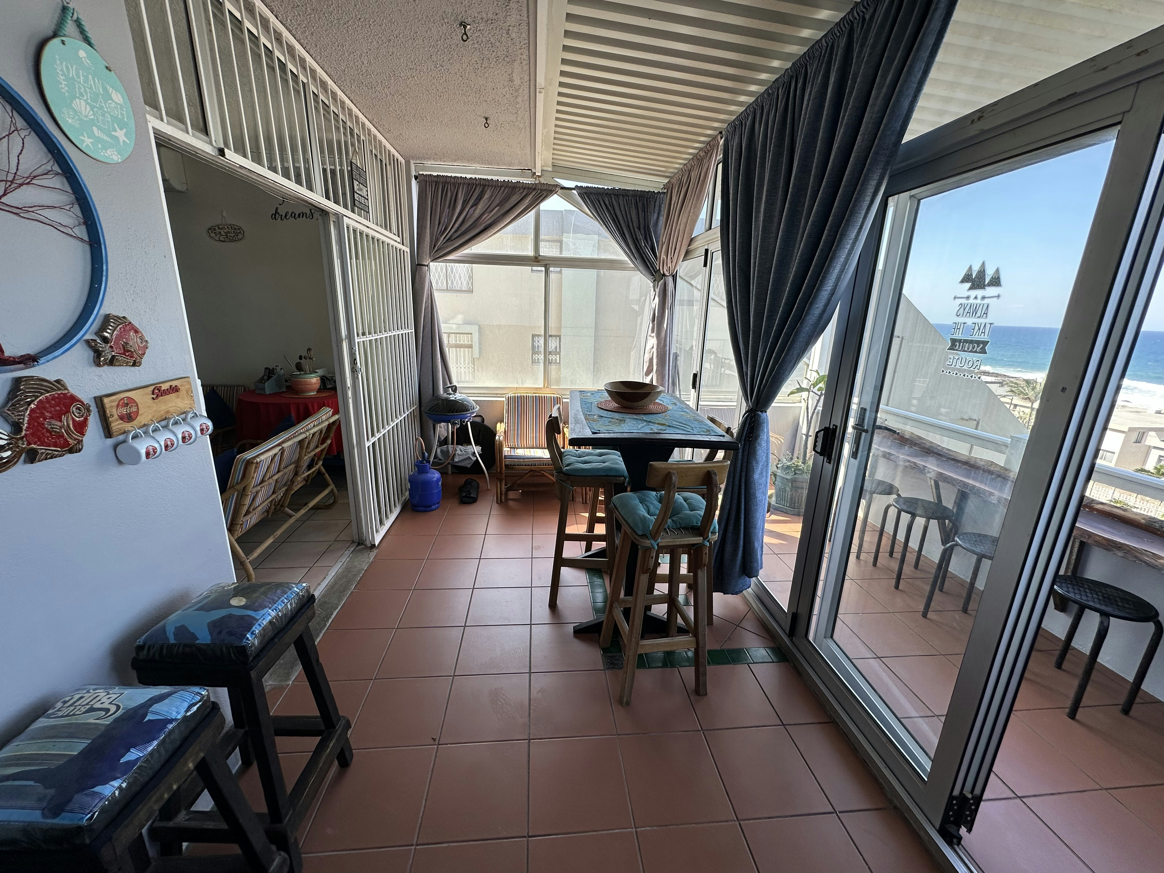 The location of the premises was perfect but the unit itself was not nice at all. We had a beautiful sea view and we enjoyed breakfast and supper at the balcony. Though I must say the hygiene of the unit was poor, the tiles were a bit sticky to walk bare footed, there was an unpleasant smell in the kitchen that smelled a bit like poo. Outdoor chairs were used in the sitting room instead of comfortable couches. There was no effort at all towards making the bedroom nice and comfortable, very old looking bedding was used. Basically the whole interior of the unit is old fashioned and doesn't have that exciting holiday spirit. Margate is awesome, I just wish we had booked a different unit.